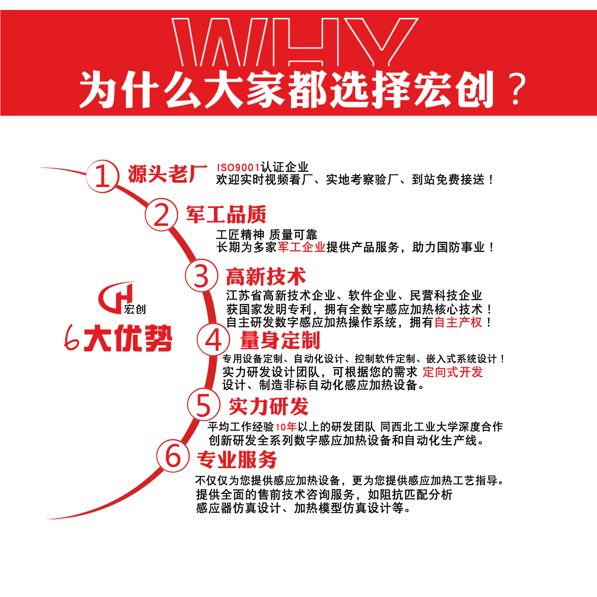 蘇州宏創(chuàng)高頻加熱設備有限公司位于江蘇省蘇州市常熟經(jīng)濟技術開發(fā)區(qū)內,是一家科技型高新技術企業(yè),公司擁有全數(shù)字、智能型感應加熱核心專利,專注于全系列數(shù)字化感應加熱電源及自動化生產(chǎn)線的研發(fā)、生產(chǎn)和銷售,產(chǎn)品涉及航空航天、機械制造、電力電子、五金機電、五金工具、制冷暖通等行業(yè)及領域。 我廠在感應加熱領域擁有數(shù)十年經(jīng)驗,服務過數(shù)百個行業(yè),超過1000多家客戶,并且持續(xù)為數(shù)十家軍工企業(yè)提供產(chǎn)品和服務,助力國防事業(yè)!典型客戶有:航天四院、兵器部、蘭州坦克、西航空、三角航空、中國北車、玉柴、長城汽車、比亞迪汽車...... 助力《中國制造2025計劃》,我司還自建兩個金屬感應熱處理實驗室,并且免費對外開放!您只需要把要測試的工件通過快遞或者您親自帶過來即可,我們工程師會為您現(xiàn)場直播實驗過程、并提供成熟的熱處理工藝解決方案,從而最大限度地降低您的設備選型風險和成本! 歡迎您蒞臨我廠參觀指導,同時我們也支持“視頻直播驗廠”,預約電話:19951013511